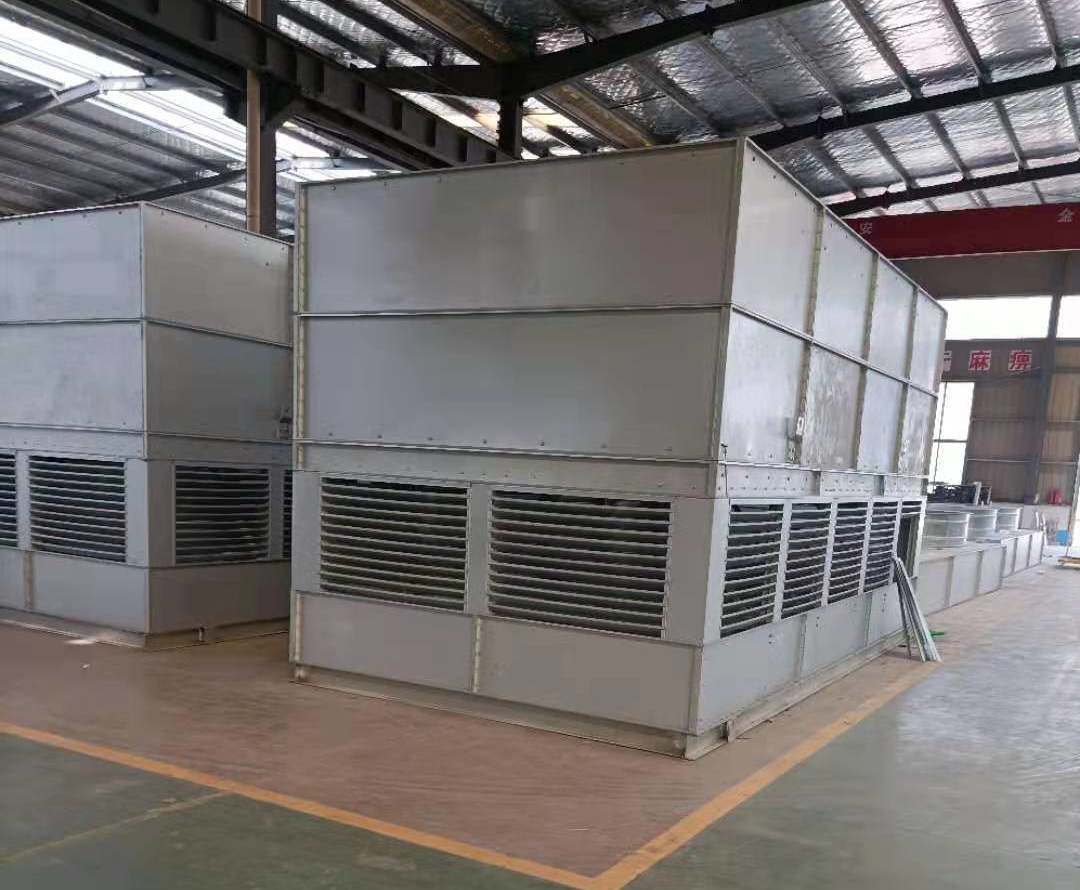 風(fēng)冷部分:工作流體(軟水或其他液體)在閉式冷卻塔的盤管內(nèi)循環(huán),流體熱量被盤管的管壁吸收后,由冷卻塔底部進(jìn)風(fēng)口進(jìn)入的新風(fēng)流經(jīng)冷卻器進(jìn)行換熱后通過頂部的風(fēng)機(jī)把管壁的熱量排出機(jī)外。