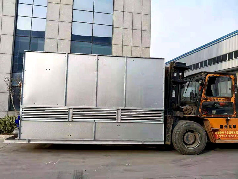 風(fēng)冷部分:工作流體(軟水或其他液體)在閉式冷卻塔的盤管內(nèi)循環(huán),流體熱量被盤管的管壁吸收后,由冷卻塔底部進(jìn)風(fēng)口進(jìn)入的新風(fēng)流經(jīng)冷卻器進(jìn)行換熱后通過頂部的風(fēng)機(jī)把管壁的熱量排出機(jī)外。
